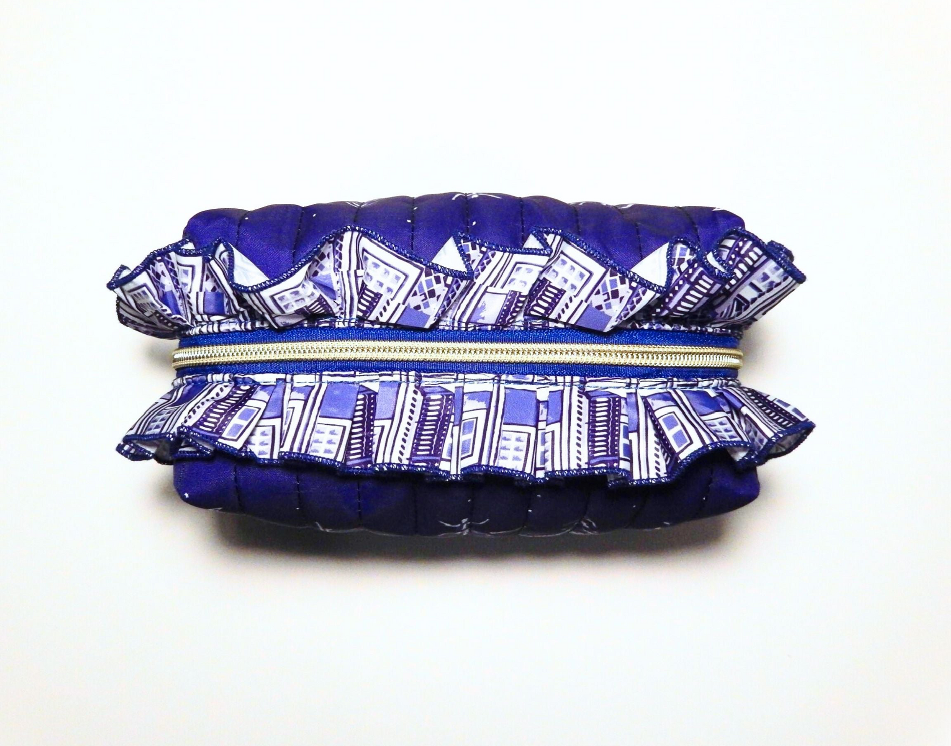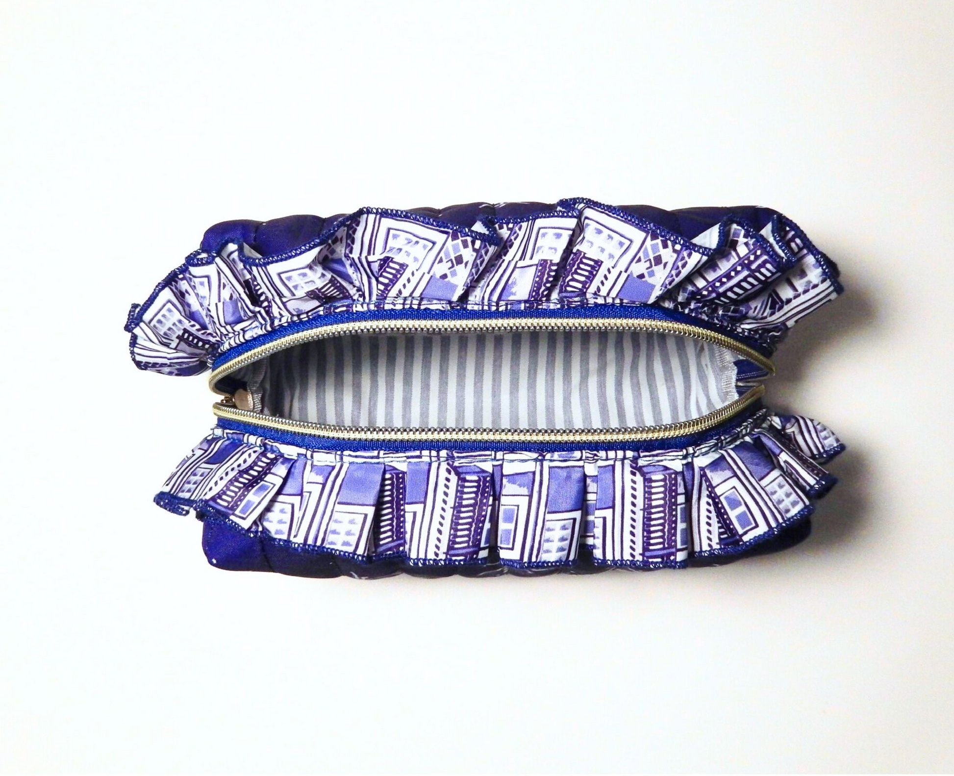 The signature ruffle trim and a charming blue-and-white striped interior bring playful flair to your everyday routine, while an interior pocket keeps your essentials neatly tucked away. Carry a touch of poetry with you wherever you go!